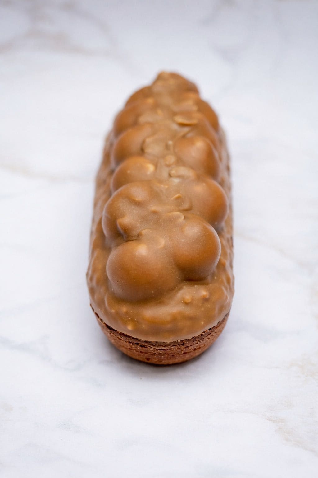 Appareil à cake tendre cacahuète, praliné cacahuète fleur de sel bleu de Perse, ganache cacahuète croustillant quinoa soufflé, glaçage chocolat caramélisé.