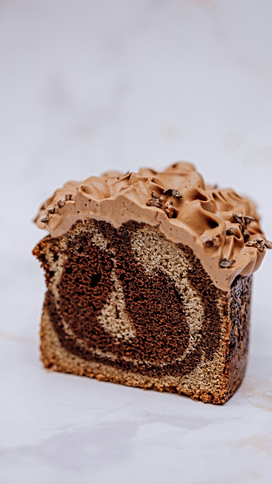 Appareil à cake tendre vanille et cacao cru, ganache vanille bio de Madagascar, ganache chocolat noir Nicolas berger sans sucre, grué de cacao.