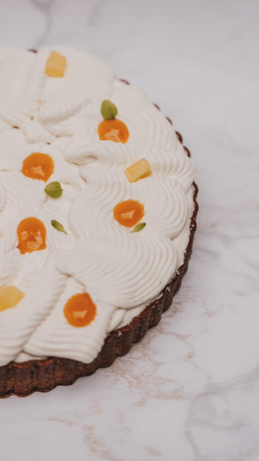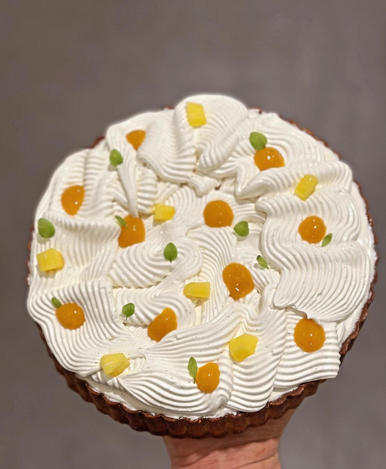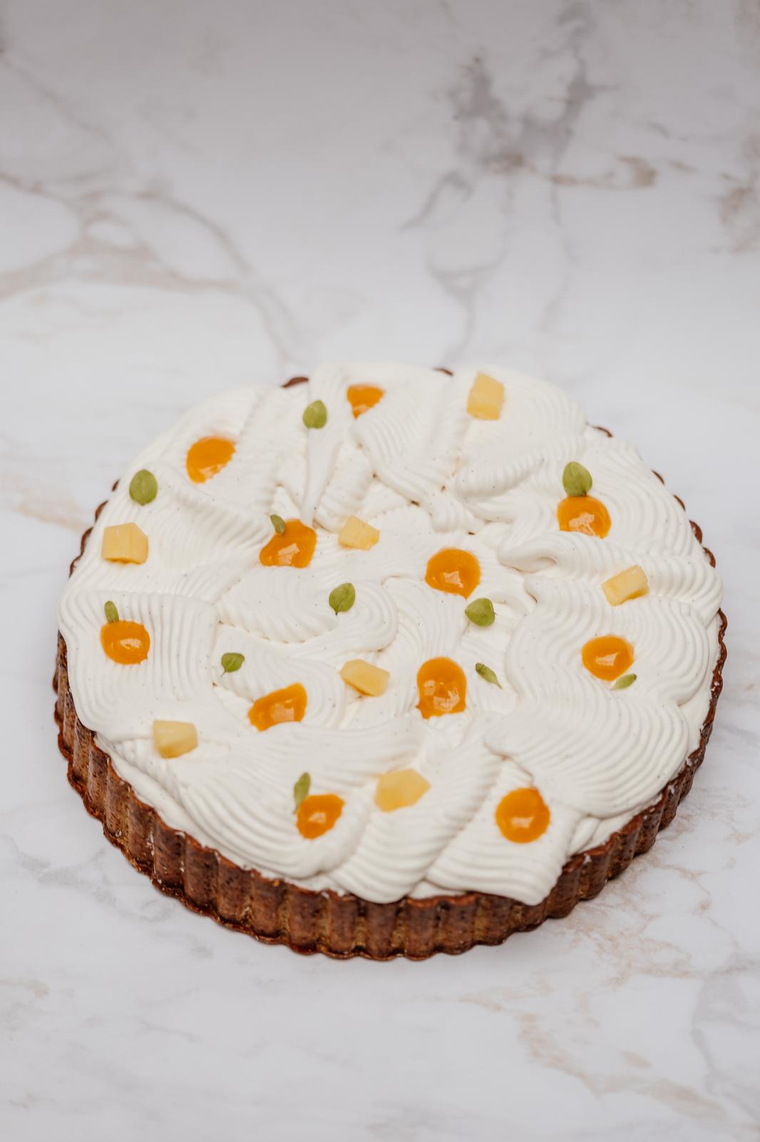Pâte sablée vanille, crème d’amande pécan, praliné pécan, gel mangue/passion, mangue fraîche, chantilly légère vanille de Madagascar bio, farine complète pauvre en gluten.